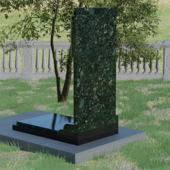 Геометрия модели продумана до мелочей: левая сторона стелы дополнена асимметричным вертикальным элементом с многоступенчатым завершением. Эта "ступенчатость" придает конструкции динамику и современный вид, выделяя её среди традиционных прямоугольных форм. Особое значение имеет сочетание фактур: идеально гладкая, зеркальная полировка основной части стелы эффектно контрастирует с шероховатой, тактильно приятной поверхностью боковых элементов. Зеркальный блеск гранита не только подчеркивает глубину цвета, но и защищает камень от внешних воздействий, позволяя мемориалу сохранять первозданный вид на протяжении столетий.