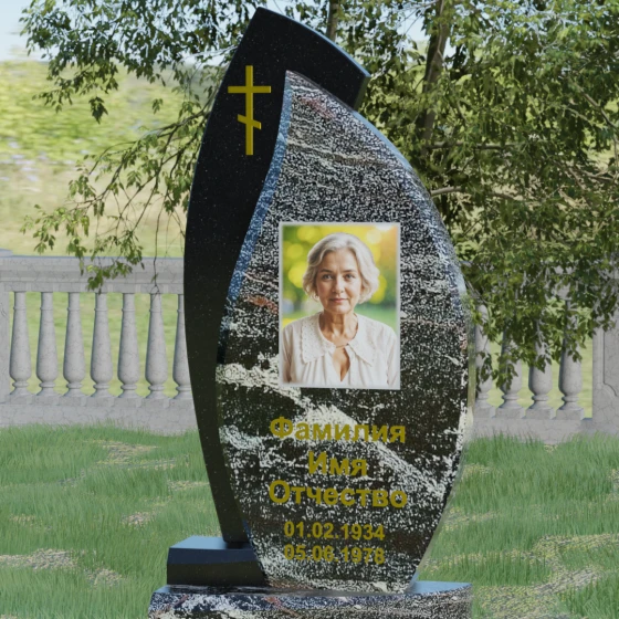 Основой художественного замысла выступает эффектная асимметрия и игра контрастных фактур. Центральная часть надгробия, предназначенная для размещения портрета и памятных надписей, выполнена в форме изящного лепестка или капли из глубокого черного камня. Ее плавные, текучие линии символизируют бесконечность бытия и чистоту души. Оправа, охватывающая центральный элемент с левой стороны, имеет более строгую, динамичную геометрию с выраженным острым углом в верхней части, что создает визуальный эффект защищенности и опоры. Особое внимание уделено деталям: на левом «крыле» композиции лаконично расположился восьмиконечный православный крест, выполненный в технике глубокой гравировки с последующим золочением. Это придает всей конструкции духовную завершенность и благородство.