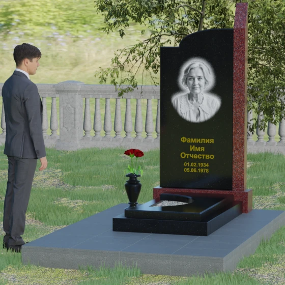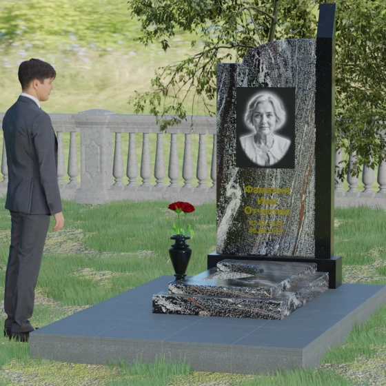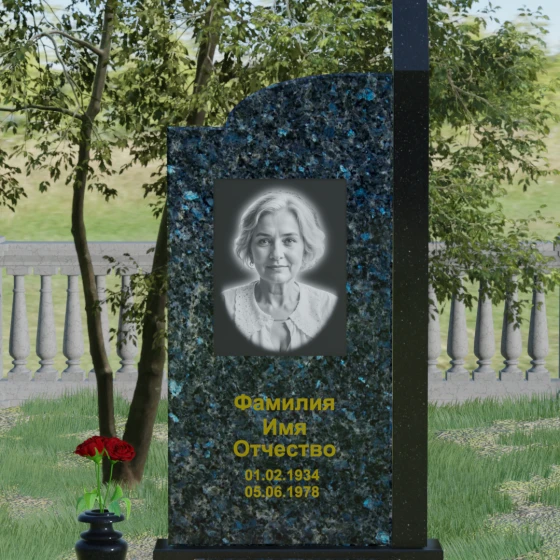 Широкое полотно основной стелы открывает безграничные возможности для художественного оформления. Форма идеально подходит для размещения крупного портрета в технике гравировки с мягкой растушевкой («ореолом»), что создает эффект живого взгляда. Золоченая кириллица имен и дат особенно выразительно смотрится на темном фоне, придавая мемориалу статусность и торжественность. Для того чтобы отразить индивидуальность и характер ушедшего человека, данная модель доступна в 8 цветовых решениях. Вы можете выбрать классический черный гранит Габбро-диабаз, благородный серо-белый Мансуровский гранит, насыщенный красный Лезниковский или глубокий коричневый Дымовский. Также доступны экзотические варианты: лесной Балтик грин, искрящийся Блю Перл, контрастный амфиболит или сияющий белизной мрамор Тассо. Комбинирование двух видов камня позволяет создать уникальный контраст фактур и оттенков, подчеркивая архитектурную сложность изделия.