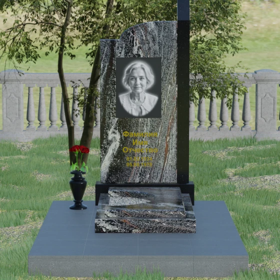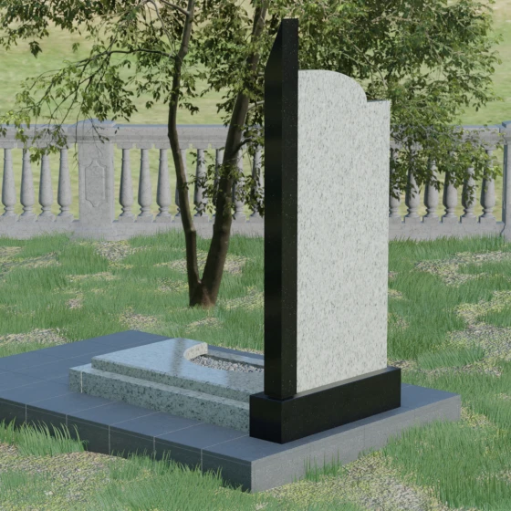 Данная мемориальная композиция представляет собой образец современного архитектурного искусства, где строгая геометрия встречается с мягкой природной грацией. Дизайн изделия построен на эстетике асимметрии: левый край стелы выполнен в виде четкого, волевого «шага», который мгновенно переходит в плавную, нисходящую дугу с правой стороны. Такая форма символизирует баланс между земной твердостью и бесконечным небесным покоем. Вертикальная стела дополнена узким акцентным столпом из контрастного камня, который создает мощную вертикаль, визуально устремляя всю конструкцию ввысь. Тщательно выверенные пропорции позволяют этому монументу органично вписаться в ландшафт любого мемориального комплекса, выделяясь своей лаконичностью и благородством линий.