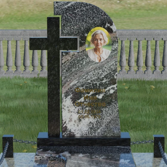 Правая часть стелы — это широкое каменное полотно с мягким, плавным изгибом в верхней части, напоминающим небесный свод или церковный купол. Контраст между прямолинейностью креста и текучестью основной плиты создает уникальный художественный ритм. Боковые грани и верхушка изделия отполированы до зеркального блеска, в котором отражается небо, в то время как глубокая гравировка текста и портрета в овальной нише подчеркивают индивидуальность монумента. Особую массивность конструкции придает основание — монумент возведен на высокий гранитный цоколь. По периметру установлены монументальные столбики с декоративными фасками, соединенные массивными цепями, что создает защищенный контур и атмосферу уединенного покоя.