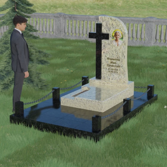 Каждый элемент этого надгробия несет в себе скрытый смысл. Высокий крест, интегрированный в саму структуру камня, выступает символом духовного покровительства и незыблемой веры. Асимметричная форма стелы олицетворяет жизненный путь, который никогда не бывает абсолютно ровным, но всегда стремится вверх, к свету. Массивное основание и каменное ограждение с цепями символизируют крепость семейных уз и нерушимую границу между суетным миром и вечным покоем. Эта форма вызывает чувство защищенности и монументальности, подчеркивая, что память о дорогом человеке так же тверда и вечна, как сам гранит.