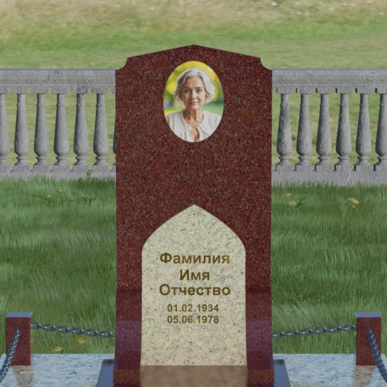 Геометрия стелы идеально приспособлена для размещения портрета в верхней части. Овальный медальон, расположенный по центру, визуально уравновешивает композицию, находясь над «аркой» с текстом. Золоченая гравировка на светлом фоне арки читается легко и четко даже с расстояния. Завершенность участку придают массивные гранитные столбики, соединенные тяжелыми декоративными цепями. Это ограждение не загромождает пространство, но четко обозначает границы частной территории, создавая атмосферу уединения и защищенности. Каждая деталь — от формы фаски на столбиках до надежных креплений цепей — продумана мастерами-камнерезами для того, чтобы мемориал стал достойным воплощением вашей любви и незыблемой памяти на долгие века.
