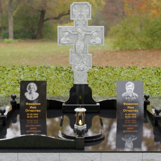 Боковые вертикальные элементы идеально подходят для размещения портретов. Будь то классическая гравировка, сохраняющая четкость линий на века, или современные фотокерамические вставки в золоченом обрамлении — форма стел позволяет расположить информацию максимально гармонично и читаемо. Продуманная архитектура комплекса позволяет объединить память о двух людях, создав единое пространство любви и скорби, которое станет достойным символом вечной памяти для будущих поколений.