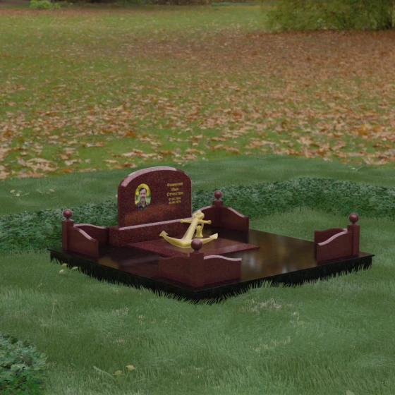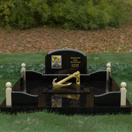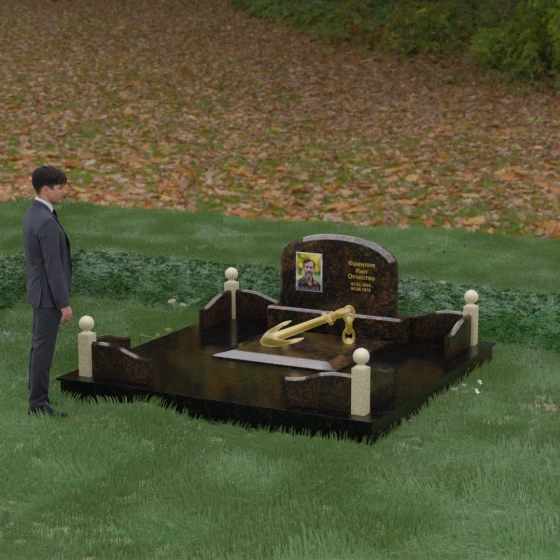 • Центральный символ: На надгробной плите расположен объемный декоративный элемент в виде золотого якоря с массивной цепью. Этот символ олицетворяет надежду, твердость характера и профессиональный путь, связанный со стихией, становясь смысловым центром всего мемориала.