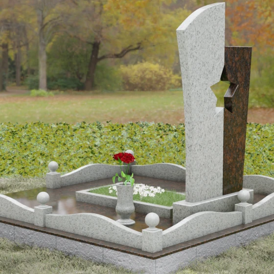 Особое внимание уделено благоустройству участка. Мемориал установлен на высокий гранитный цоколь, который не только служит надежной опорой, но и визуально возвышает конструкцию над землей. Плавные изгибы бордюра и полированные каменные шары по периметру создают завершенный архитектурный ансамбль. Наличие интегрированной каменной вазы, выполненной в едином стиле с основным изваянием, позволяет поддерживать порядок и эстетику места захоронения, подчеркивая заботу и уважение близких.