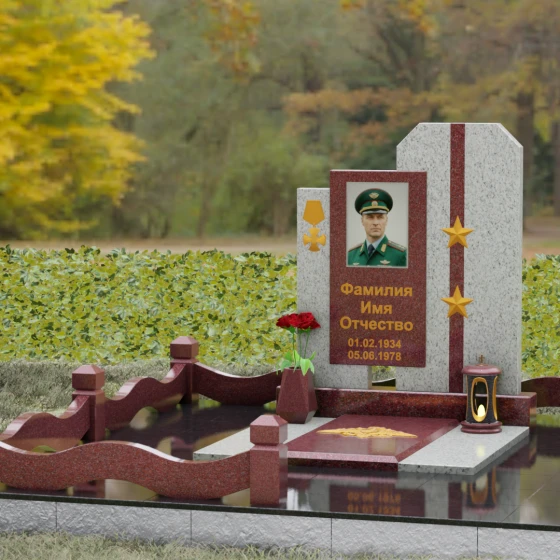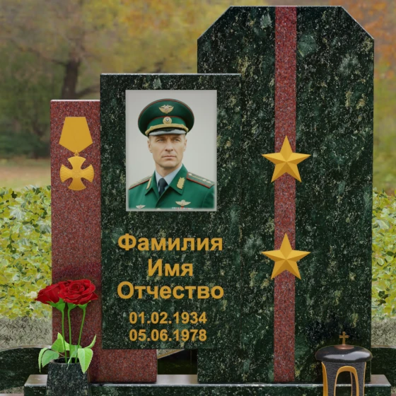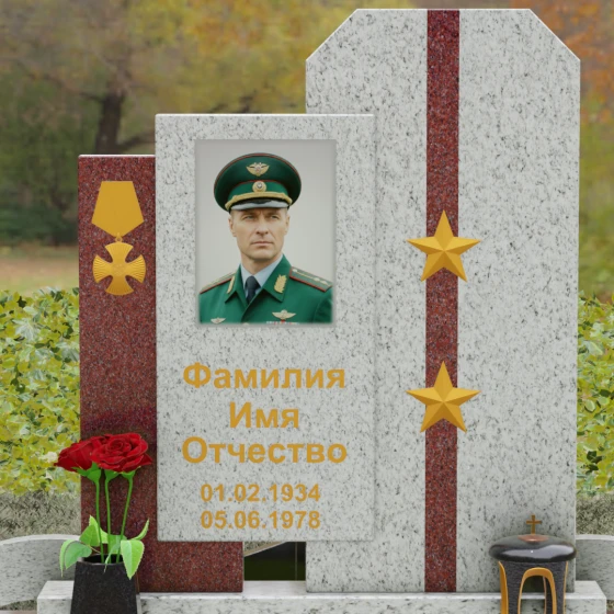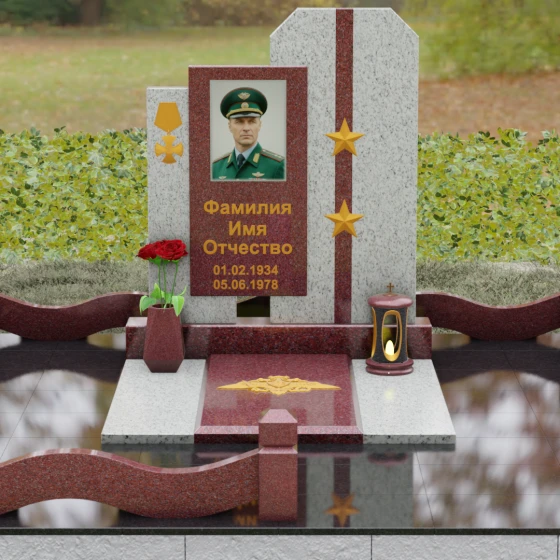 Выбор мемориального комплекса — это всегда поиск баланса между строгостью формы и глубиной чувств. Модель Артикул 201 представляет собой сложную архитектурную композицию, которая идеально подходит для увековечивания памяти сильного, волевого человека, посвятившего жизнь служению. Надгробие из натурального камня состоит из трех вертикальных элементов, создающих динамичный, ступенчатый силуэт. Центральная стела, предназначенная для размещения портрета и основной информации, обрамлена боковыми пилонами из контрастного красного гранита. Такая геометрия символизирует устойчивость, надежную опору и непоколебимость духа. Сочетание строгих прямых линий и аккуратных фасок на вершинах придает памятнику торжественный, парадный вид, подчеркивая заслуги и особый статус усопшего.