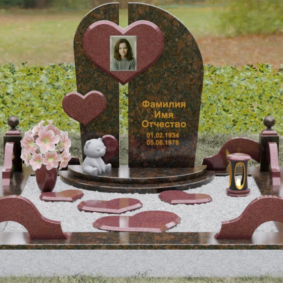 Визуальная концепция модели строится на гармоничном сочетании двух асимметричных вертикальных стел, выполненных из темного камня с безупречной зеркальной полировкой. Центральным элементом композиции является объемное сердце из контрастного красного гранита, которое словно объединяет две половины памятника. В его центре располагается портрет, обрамленный тонкой фаской, что создает эффект драгоценного медальона. Дополнительный акцент вносит второе, меньшее по размеру сердце, закрепленное на левой части стелы, что добавляет динамики и многослойности художественному образу.