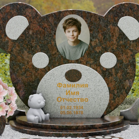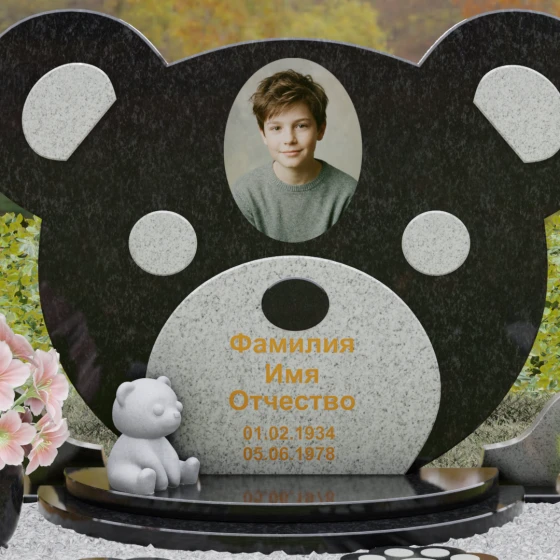 Эта мемориальная композиция представляет собой уникальный художественный проект, созданный для того, чтобы выразить бесконечную нежность и светлую печаль. Главная стела выполнена в форме головы медвежонка — символа чистоты, детства и вечного сна. Плавные, округлые линии силуэта лишены острых углов, что придает изделию визуальную мягкость и умиротворение. Мастера-камнерезы виртуозно передали геометрию образа: симметричные ушки со светлыми вставками и выразительные круглые глаза, созданные методом инкрустации камня другого оттенка. Игра контрастов между глубоким темным основанием и светлым матовым срезом декоративных элементов создает эффект живого объема, заставляя свет играть на полированных гранях и подчеркивая безупречную пластику камня.