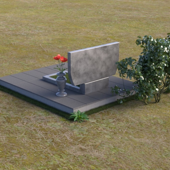 Горизонтальная плита, расположенная перед стелой, служит дополнительным элементом композиции, объединяя все части в единое целое. Ее полированная поверхность также отражает свет, создавая ощущение простора и легкости. Тумба, выполненная из того же материала, что и стела, обеспечивает устойчивость всей конструкции. Основание памятника выполнено из серых плит, что создает контраст с черным цветом стелы и плиты, подчеркивая их элегантность.