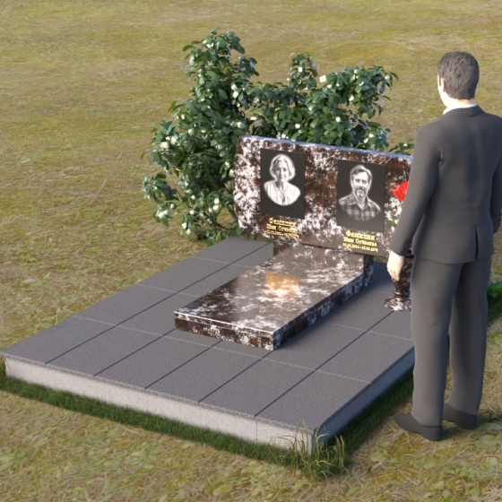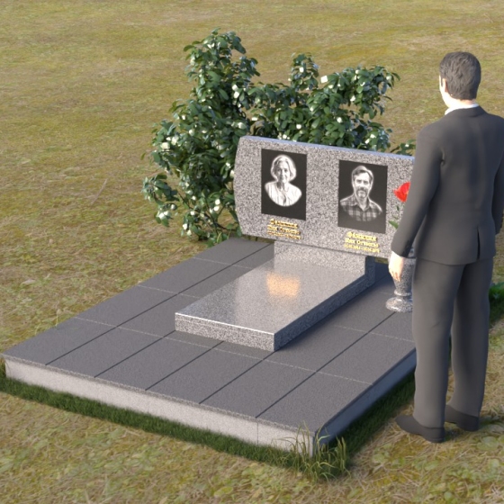 Композиция памятника строится на контрасте строгих геометрических форм и плавных линий, создавая гармоничный и запоминающийся образ. В верхней части возвышается стела из черного гранита, чья зеркальная полировка отражает небо и окружающий мир, словно напоминая о связи земного и небесного. Верхние углы стелы скруглены, смягчая строгость формы и придавая ей более мягкий, человечный облик. На стеле размещены портреты усопших, выполненные с высокой точностью и передающие их индивидуальность. Золотистые надписи имен и дат словно светятся на фоне черного камня, добавляя торжественности и значимости. У подножия стелы располагается горизонтальная плита, также выполненная из полированного черного гранита, создающая ощущение завершенности и устойчивости. Рядом – изящная ваза из того же материала, предназначенная для живых цветов, символа неувядающей памяти и любви.
