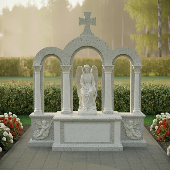 Мемориальная композиция ПН 044 представляет собой величественное архитектурное сооружение, в котором слились воедино классические мотивы и глубокий символизм. Центральное место занимает изящная скульптура скорбящего ангела, выполненная из светлого мрамора. Его фигура, облаченная в мягкие драпировки, склонена в вечной молитве, а крылья бережно сложены за спиной, создавая ощущение покоя и умиротворения. Лицо ангела выражает глубокую скорбь, но при этом излучает светлую надежду, становясь воплощением чистоты и невинности. Детализация скульптуры поражает: каждая складка одеяния, каждый завиток волос проработаны с ювелирной точностью, придавая образу реалистичность и эмоциональную глубину.