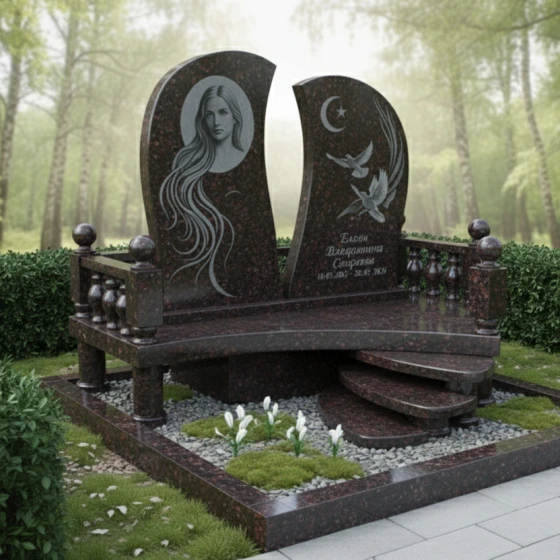Мемориальная композиция ПН 063 представляет собой уникальное художественное произведение, где каждая линия и форма наполнены глубоким символизмом. Центральный элемент – две асимметричные стелы, словно раскрытые створки книги или два крыла, стремящиеся ввысь. Их плавные, волнообразные грани отполированы до зеркального блеска, создавая игру света и тени, подчеркивающую глубину черного гранита. Левая стела, более массивная и высокая, украшена гравировкой женского лика, выполненного с невероятной детализацией. Длинные, струящиеся волосы, обрамляющие лицо, создают ощущение легкости и воздушности, контрастируя с монументальностью камня. Правая стела, чуть ниже и изящнее, несет на себе изображения двух голубей, парящих на фоне полумесяца со звездой – символы чистоты, мира и духовного вознесения. Эти элементы выполнены с тончайшей проработкой деталей, где каждая перышко и изгиб крыла кажутся живыми, а матовая фактура гравировки эффектно выделяется на фоне глянцевой поверхности.