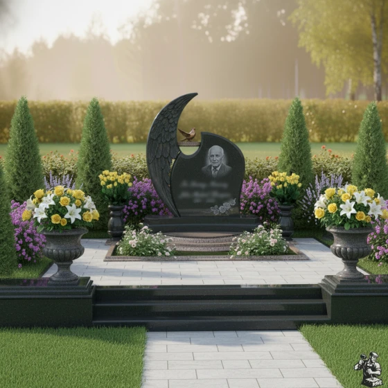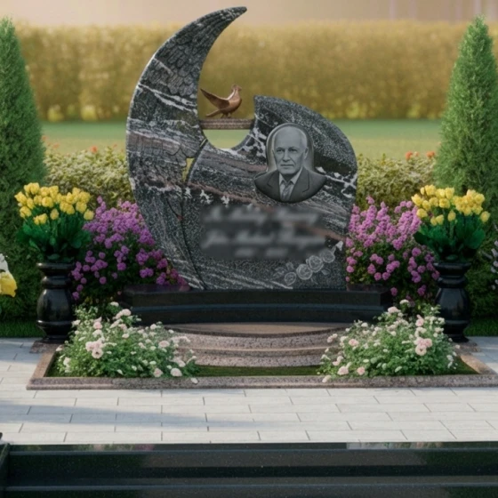 Дизайн этого гранитного монумента глубоко символичен. Форма, напоминающая ангельское крыло, олицетворяет покой, защиту и вечное упокоение души под сенью небесной благодати. Голубь, расположенный на вершине, традиционно ассоциируется с миром, надеждой и чистотой души, что делает эту композицию особенно проникновенной. Общая пластика форм, с ее плавными изгибами и мягкими линиями, создает ощущение умиротворения и безмятежности. Этот мемориал становится не просто обозначением места захоронения, а настоящим произведением искусства, выражающим глубокую любовь, уважение и стремление сохранить светлую память о человеке на долгие века.