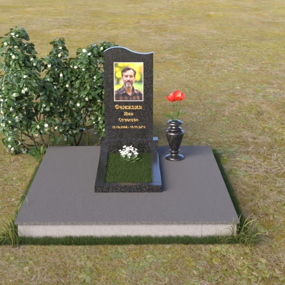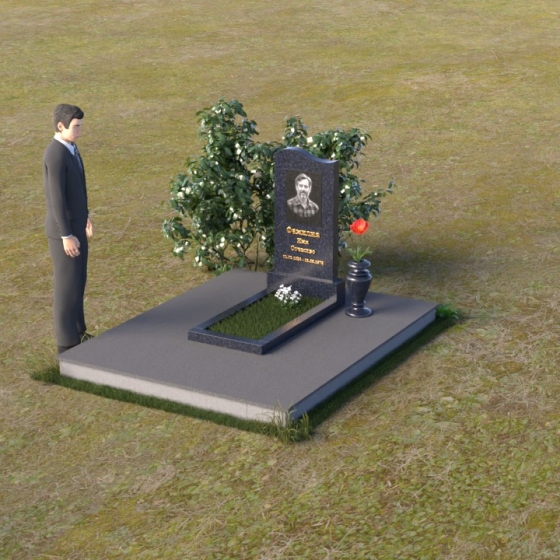 Мемориальная композиция ПВ 010 представляет собой тщательно продуманное архитектурное решение, где каждый элемент несет свою смысловую нагрузку. Стела выполнена в форме строгой, но элегантной арки, с плавным, закругленным верхом, словно стремящимся ввысь. Боковые грани стелы аккуратно скруглены, смягчая строгость формы и придавая ей ощущение спокойствия и завершенности. На лицевой стороне выгравирован портрет усопшего, выполненный с высоким уровнем детализации, а ниже – надпись с именем и датами жизни. Отдельно стоит отметить подставку под стелу. Она имеет прямоугольную форму с зеркальной полировкой, которая отражает небо и окружающий пейзаж, создавая ощущение легкости и воздушности. Скошенные фаски по периметру подставки добавляют ей изысканности и подчеркивают четкость линий.