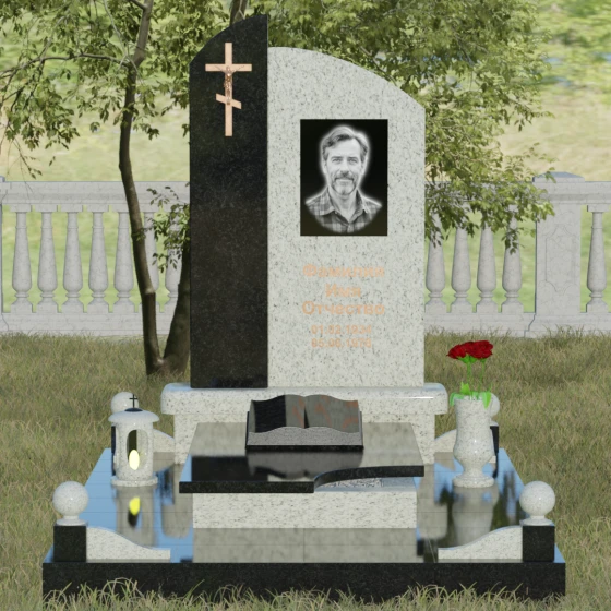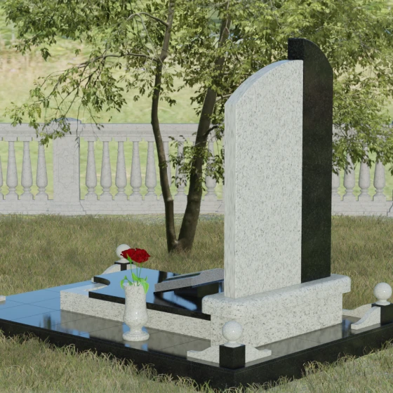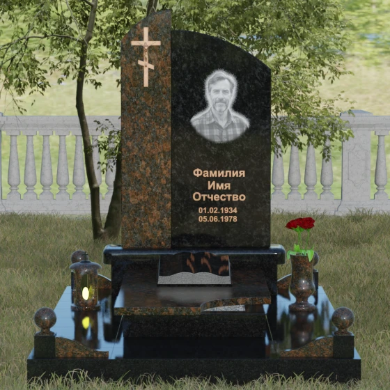 Данное ритуальное изделие представляет собой выразительную художественную композицию, построенную на гармонии двух различных фактур и форм. Выбор этой модели обусловлен её глубоким символизмом: асимметричное разделение стелы на две части олицетворяет земной и небесный пути. Левая часть, выполненная в виде строгого вертикального столпа из насыщенного цветного гранита, служит основанием для объемного православного креста с детально проработанным распятием. Правая же часть, имеющая мягкий, плавный изгиб верхней грани в форме волны, создает идеальное пространство для размещения портрета и памятных слов. Сочетание строгой геометрии и лиричного изгиба позволяет выразить всю многогранность чувств — от глубокой скорби до светлой памяти.