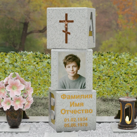 Представленное надгробие из натурального камня (Артикул: 142) — это не просто памятный знак, а монументальное архитектурное произведение, выполненное в стиле современного мемориального минимализма. В отличие от стандартных решений, данная модель представляет собой композицию из трех массивных кубических блоков, установленных друг на друга. Такая форма символизирует устойчивость, многогранность человеческой жизни и незыблемость семейного фундамента. Каждая грань камня подвергнута безупречной зеркальной полировке, которая создает глубокую игру света и отражений, подчеркивая природную чистоту материала.