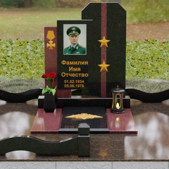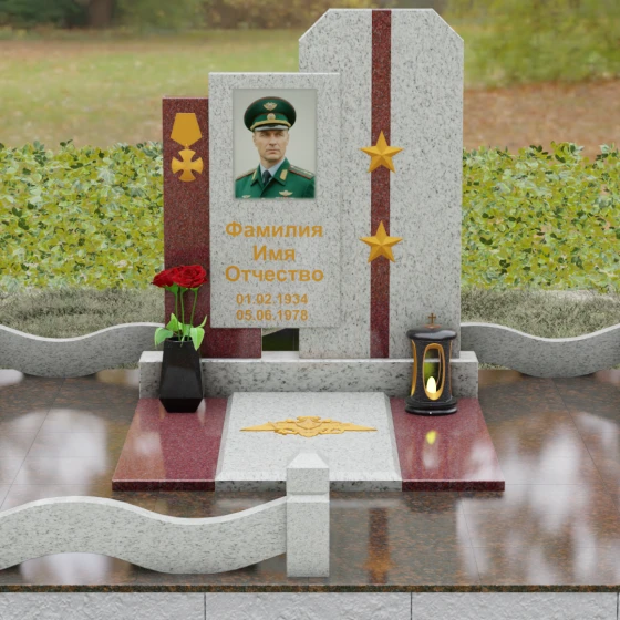 Выбор мемориального комплекса — это всегда поиск баланса между строгостью формы и глубиной чувств. Модель Артикул 201 представляет собой сложную архитектурную композицию, которая идеально подходит для увековечивания памяти сильного, волевого человека, посвятившего жизнь служению. Надгробие из натурального камня состоит из трех вертикальных элементов, создающих динамичный, ступенчатый силуэт. Центральная стела, предназначенная для размещения портрета и основной информации, обрамлена боковыми пилонами из контрастного красного гранита. Такая геометрия символизирует устойчивость, надежную опору и непоколебимость духа. Сочетание строгих прямых линий и аккуратных фасок на вершинах придает памятнику торжественный, парадный вид, подчеркивая заслуги и особый статус усопшего.