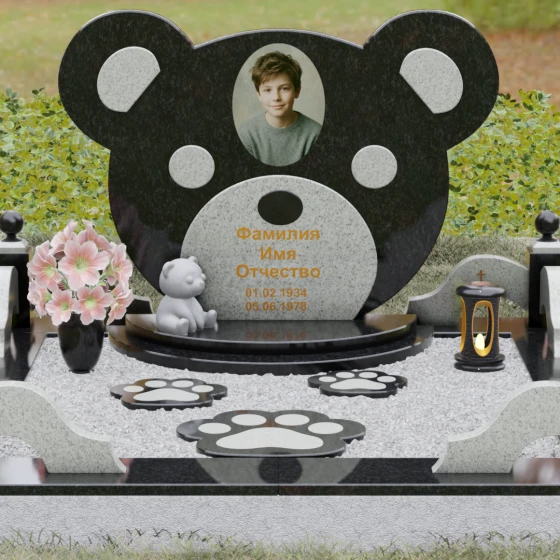 Эта мемориальная композиция представляет собой уникальный художественный проект, созданный для того, чтобы выразить бесконечную нежность и светлую печаль. Главная стела выполнена в форме головы медвежонка — символа чистоты, детства и вечного сна. Плавные, округлые линии силуэта лишены острых углов, что придает изделию визуальную мягкость и умиротворение. Мастера-камнерезы виртуозно передали геометрию образа: симметричные ушки со светлыми вставками и выразительные круглые глаза, созданные методом инкрустации камня другого оттенка. Игра контрастов между глубоким темным основанием и светлым матовым срезом декоративных элементов создает эффект живого объема, заставляя свет играть на полированных гранях и подчеркивая безупречную пластику камня.