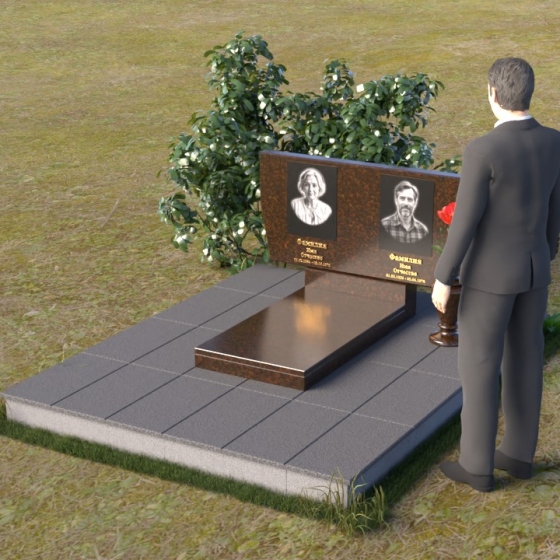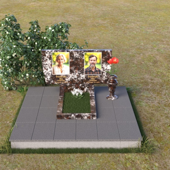 Это ритуальное изделие представляет собой гармоничное сочетание прямых линий и мягких, едва уловимых изгибов, создающих ощущение покоя и умиротворения. Стела имеет прямоугольную форму, но ее верхняя грань слегка скошена, что придает ей визуальную легкость и динамику. Обратите внимание на зеркальную полировку лицевой стороны – она отражает небо и окружающий мир, словно заключая в себе вечность. На полированной поверхности выгравированы портреты усопших и памятные надписи, выполненные с высокой точностью и детализацией. Слева от стелы, на основании, располагается небольшая горизонтальная плита с аналогичной полировкой, создающая дополнительное пространство для цветов или памятных предметов. Основание памятника выполнено из серого камня с матовой фактурой, что создает контраст с блестящей стелой и придает композиции устойчивость и завершенность. Рядом с плитой установлена ваза, выполненная из того же черного полированного гранита, что и стела, что обеспечивает единство стиля и служит достойным обрамлением для живых цветов, символизирующих вечную память.
