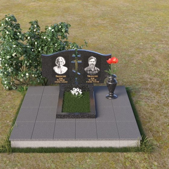 Величественная стела памятника ПГ016 представляет собой композицию из двух вертикальных элементов, объединенных общей идеей и стилем. Каждый элемент имеет свою индивидуальную форму, но вместе они создают гармоничный и целостный образ. Стела выполнена из полированного гранита глубокого черного цвета, который служит идеальным фоном для гравировки портретов и надписей. Контраст между гладкой, зеркальной поверхностью и выгравированными изображениями создает эффект глубины и выразительности. Между двумя стелами прорезана фигура креста, символизирующая веру и духовность. Этот элемент добавляет композиции особое значение и подчеркивает ее сакральный характер. Справа от портрета выгравирована изящная роза, ее лепестки искусно проработаны, создавая ощущение объема и реалистичности. Цветы символизируют любовь, память и скорбь об ушедшем.