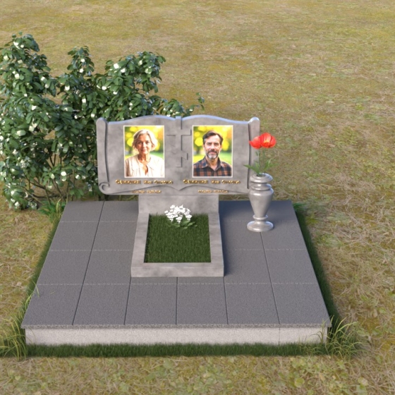 Ритуальное изделие ПГ036 представляет собой сдержанную, но исполненную достоинства композицию, созданную для сохранения памяти о близких. Два прямоугольных элемента стелы, соединенные вместе, образуют волнистый верх, напоминающий раскрытую книгу судеб. Грани обеих частей искусно обработаны, создавая мягкий, обтекаемый силуэт. Зеркальная полировка черного гранита служит идеальным фоном для гравировки портретов и надписей, словно запечатлевая светлые воспоминания в вечном камне. Слева и справа, в верхней части стелы, вырезаны лаконичные кресты, символизирующие веру и надежду. Тонкие линии врезаются в полированную поверхность, создавая игру света и тени, и добавляя глубину изображению. Горизонтальная плита, расположенная перед стелой, выполнена из того же черного гранита с зеркальной полировкой, отражая небо и окружающий пейзаж, создавая ощущение легкости и воздушности. Вместе с тем, основание памятника выполнено из серого камня, что придает всей композиции устойчивость и основательность.