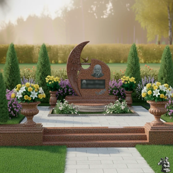 Дизайн этого гранитного монумента глубоко символичен. Форма, напоминающая ангельское крыло, олицетворяет покой, защиту и вечное упокоение души под сенью небесной благодати. Голубь, расположенный на вершине, традиционно ассоциируется с миром, надеждой и чистотой души, что делает эту композицию особенно проникновенной. Общая пластика форм, с ее плавными изгибами и мягкими линиями, создает ощущение умиротворения и безмятежности. Этот мемориал становится не просто обозначением места захоронения, а настоящим произведением искусства, выражающим глубокую любовь, уважение и стремление сохранить светлую память о человеке на долгие века.