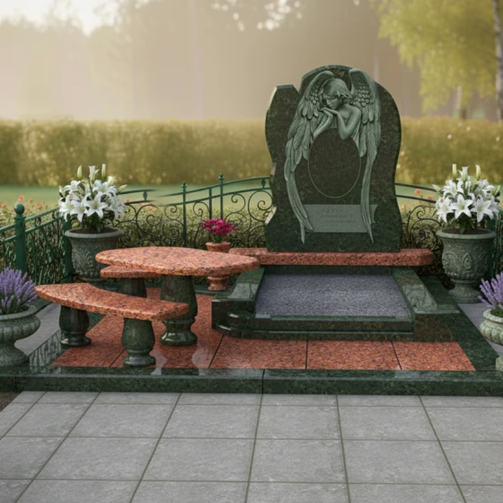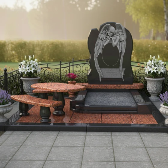 Представляем вашему вниманию ритуальное изделие Артикул: ПН 098 — мемориальный комплекс, который воплощает в себе глубокую скорбь и вечную память, заключенную в камне. Центральный элемент композиции — стела, выполненная в форме изящной арки, словно врата в иной мир, или раскрытая книга, хранящая бесценные воспоминания. Ее верхняя часть имеет плавный, округлый изгиб, который мягко переходит в строгие вертикальные линии, создавая ощущение завершенности и гармонии. Особое внимание привлекает объемная резьба, изображающая скорбящего ангела с опущенной головой и сложенными крыльями, расположенного на фронтальной стороне стелы. Каждая деталь его фигуры — от пера на крыльях до складок одеяния — выполнена с поразительной точностью, подчеркивая мастерство резчика и придавая изображению пронзительную реалистичность. Фактура камня играет на контрастах: зеркальная черная полировка основной поверхности стелы эффектно оттеняет светлый, матовый срез камня на резных элементах, создавая выразительный визуальный объем и глубину. Этот контраст усиливает эмоциональное воздействие и подчеркивает художественную ценность комплекса.