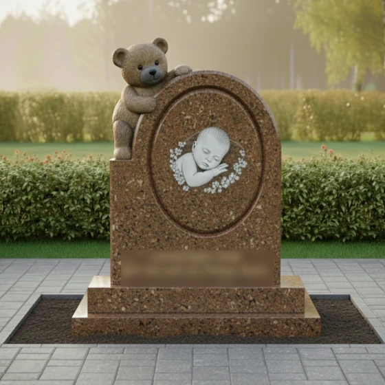 Центральным элементом композиции является уникальная объемная резьба в виде плюшевого медвежонка, который бережно обнимает основное вертикальное полотно памятника. Медведь выполнен с поразительной детализацией: мастера передали фактуру «шерсти» и мягкие складки, создавая ощущение тепла и защиты. Этот образ — символ верного стража детского сна, вечного спутника, который остается рядом, когда слова становятся излишними. Фигура медведя контрастирует с идеально гладкой, зеркальной поверхностью основного камня, создавая сложную игру света и тени.