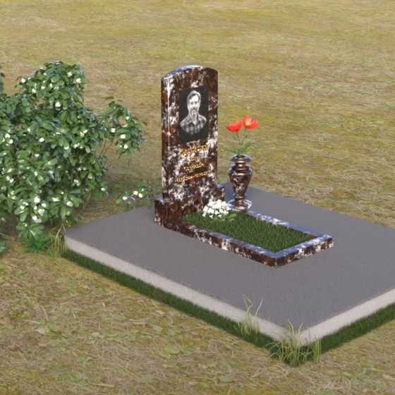 Благодаря своей лаконичной форме, эта стела предоставляет широкие возможности для оформления. Портрет усопшего будет гармонично смотреться как в верхней части стелы, так и чуть ниже центра. Золотое тиснение имени и дат жизни будет элегантно выделяться на фоне полированного камня, создавая четкий и легко читаемый образ. Небольшая тумба, расположенная перед стелой, может служить местом для возложения цветов и памятных вещей. Мы рекомендуем выбирать для этой модели сдержанные, лаконичные шрифты, которые подчеркнут общую элегантность композиции. Подумайте о возможности добавления небольшого бронзового барельефа или скульптуры, отражающей профессию или увлечения ушедшего человека. Это добавит индивидуальности и сделает место памяти еще более личным и значимым. Ваза, выполненная в едином стиле с монументом, завершит композицию и придаст ей законченный вид.
