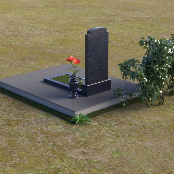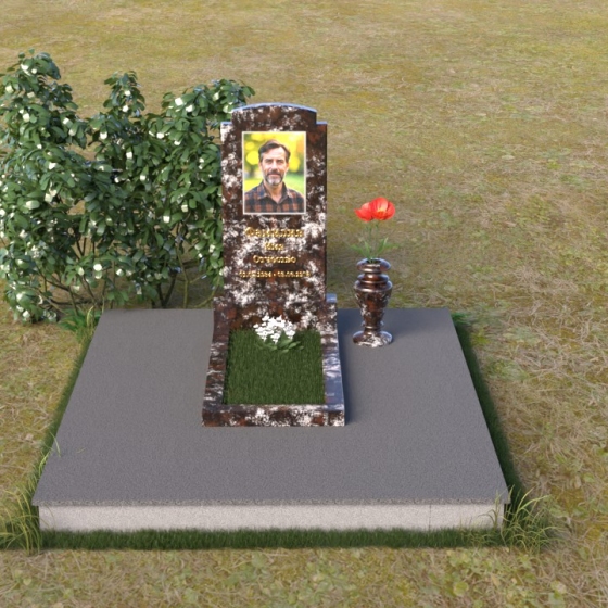 Основной акцент в этой модели сделан на контрасте фактур. Зеркальная полировка черного гранита Габбро-диабаз, из которого выполнена стела, создает эффект бесконечности, отражая небо и окружающий мир. На этом фоне особенно выразительно смотрится гравировка портрета и надписи, выполненные с ювелирной точностью. Нижняя часть стелы, переходящая в горизонтальную плиту, также выполнена из черного гранита, но уже с матовой обработкой, что придает композиции дополнительную глубину и текстуру. Рядом располагается ваза из того же гранита, выполненная в классическом стиле, предназначенная для живых цветов, которые станут символом памяти и любви.