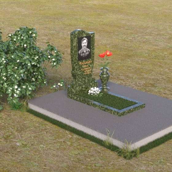 Величественная стела памятника ПВ 015 выполнена в строгой, но элегантной форме. Верхняя часть памятника имеет плавный, волнообразный силуэт, что придает ему мягкость и изящество. Сглаженные углы и отсутствие острых граней создают ощущение покоя и умиротворения. Боковые грани стелы слегка скошены, что визуально облегчает конструкцию и добавляет ей динамичности. Фаска, обрамляющая верхнюю часть памятника, подчеркивает его контур и придает завершенность образу. Нижняя часть стелы, переходящая в тумбу, имеет строгую прямоугольную форму, обеспечивая устойчивость и надежность всей конструкции. Зеркальная полировка поверхности камня отражает окружающий мир, создавая ощущение глубины и света. На стеле располагается портрет усопшего, выполненный с высокой точностью и детализацией, а также памятная надпись, нанесенная золотыми буквами.