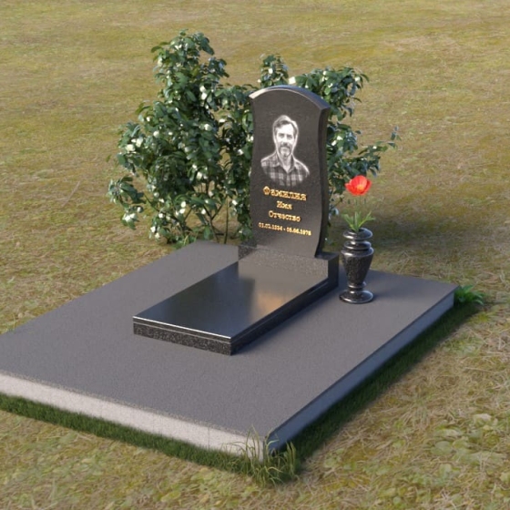 Данная модель предоставляет широкие возможности для индивидуального оформления. Портрет усопшего, выполненный методом гравировки, идеально вписывается в общую композицию, занимая центральное место на стеле. Золотистые буквы надписи, контрастируя с темным фоном полированного гранита, выглядят торжественно и выразительно. Мы рекомендуем выбирать фотографии высокого разрешения для достижения максимальной детализации и реалистичности портрета. Также возможно добавление дополнительных декоративных элементов, таких как эпитафии, религиозные символы или памятные даты. Небольшая подставка, выполненная в том же стиле, что и стела, гармонично дополняет композицию и может служить местом для возложения цветов. Элегантная ваза из черного гранита, расположенная рядом с надгробием, добавляет завершенность образу и позволяет сохранить свежесть цветов на длительное время.